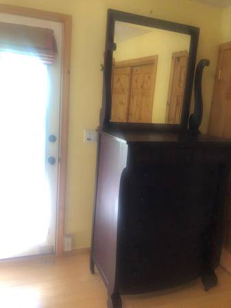 The dresser is solid wood and fairly heavy. Buyer must bring help to load, along with a moving blanket and straps if transporting in a pickup truck. (208) Eight 20- 1 Eight 3 Four.