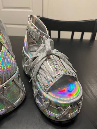 Size 8 holographic club wedges zip in the back only worn one time. DOLLS KILL