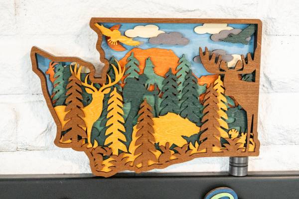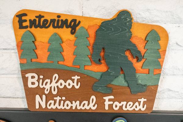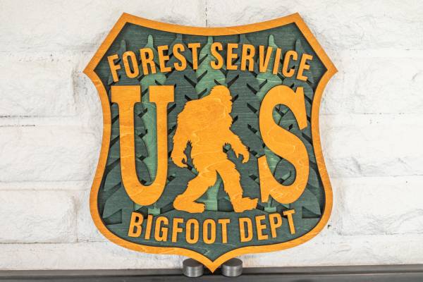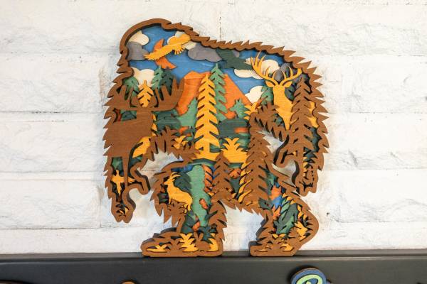 Bigfoot Sasquatch Layered Wood Art. Made from 6 layers of ⅛ inch basswood. There are 16 critters hiding in the forest scene within the Bigfoot. Has a sawtooth wall hanger ready to display on the wall.