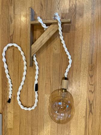 Hanging Lamp with wall bracket Bracked 18" tall, extend 13 inches from wall, 2.5" wide wood Adjustable height - could use without wall mount Oversize Bulb ~8 inches in diameter, wood cover at bulb...