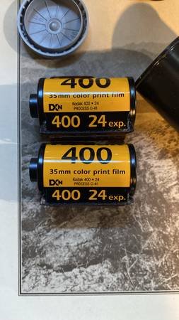 Pentax SLR body, bulk 35 mm film roller, Polaroid film, 2 rolls of 35 mm film, film canisters, camera bag, negative sleeves, photo pencils, and other trinkets.