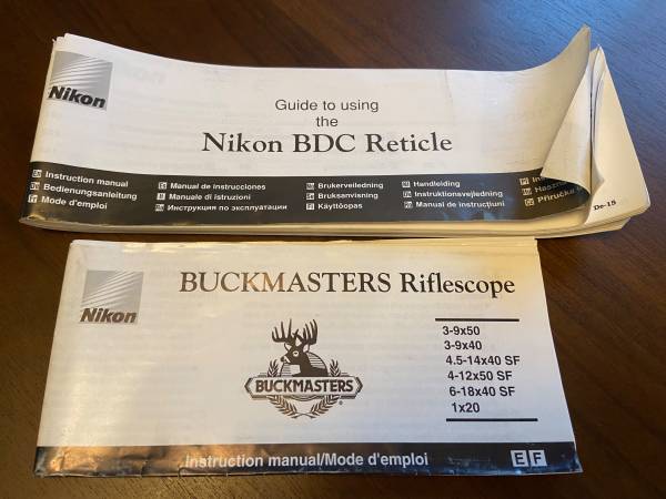 Nikon Buckmasters scope 3-9x40, with BDC reticle. Matte black with 1’ tube. The scope is in great condition. The optics are crisp and clear. The zoom and focus ring adjust smoothly. I had many successful hunts with this scope. Comes with original documentation. $100 or best offer.