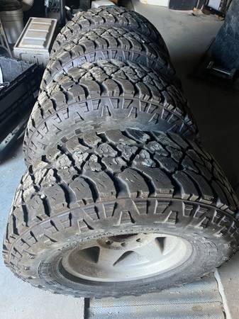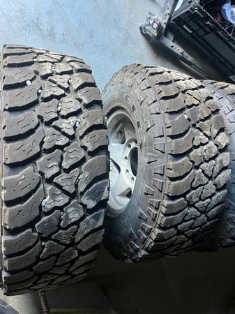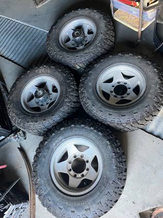 Set of near new 265/75R16 MT tires. These were on my 1997 Ford F250, have maybe 3,500 miles on them. Tires are in excellent shape. Date code 2023. Mounted on 8x6.5 aluminum wheels. Will fit Dodge, Chevy and pre 99 Ford. Sold the pickup I had them on. Great tires for upcoming snow. Asking $750 no trades. Come with the 2 center caps. Call or text only I don’t check email. Thanks.